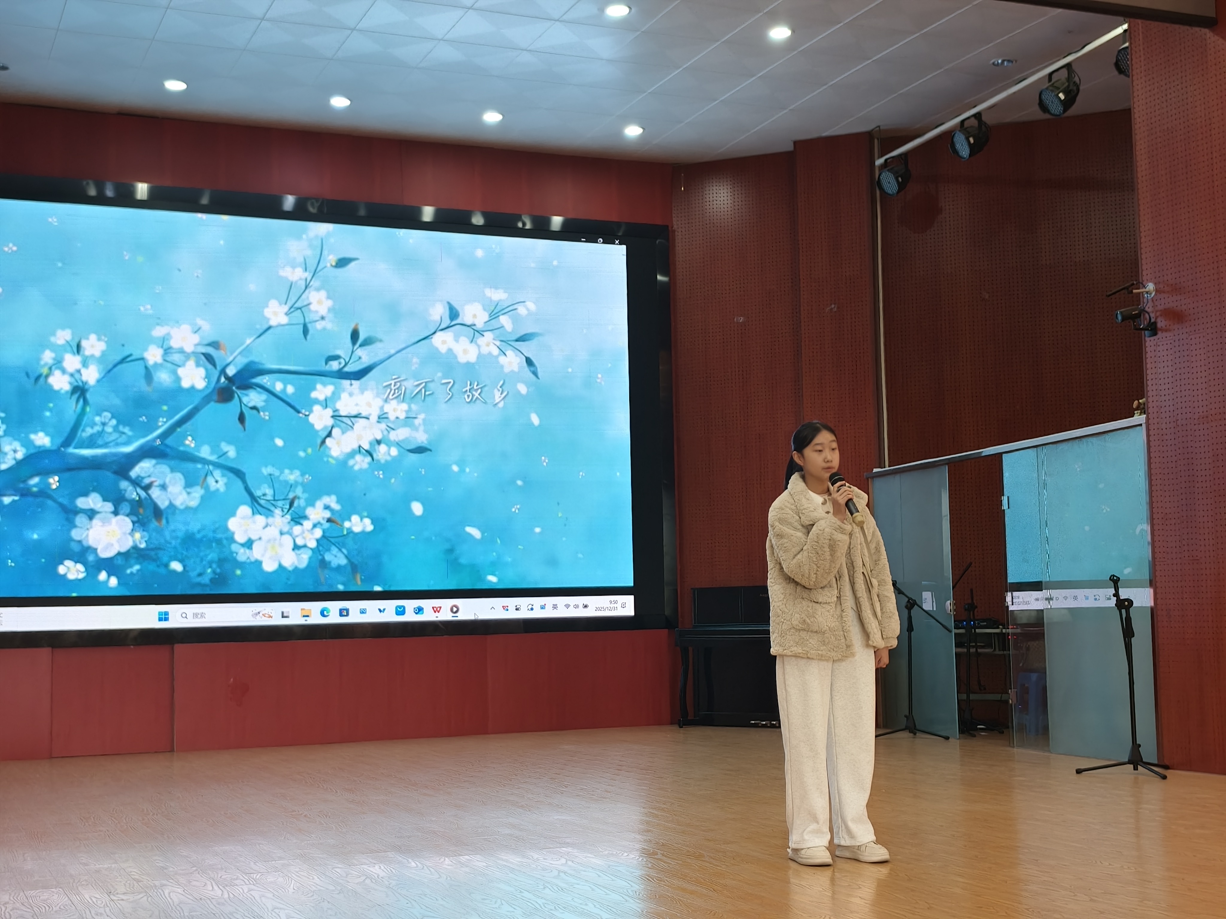 高年级组演唱结束后,比赛进入统分环节。此时,来自二年9班的周泓儒与初三4班的周煜尧姐弟俩带来表演唱《梅朵的笑脸》。他们默契的配合与纯真的演绎,为现场增添了轻松与温馨,也展现了不同学段学生之间的艺术交流。